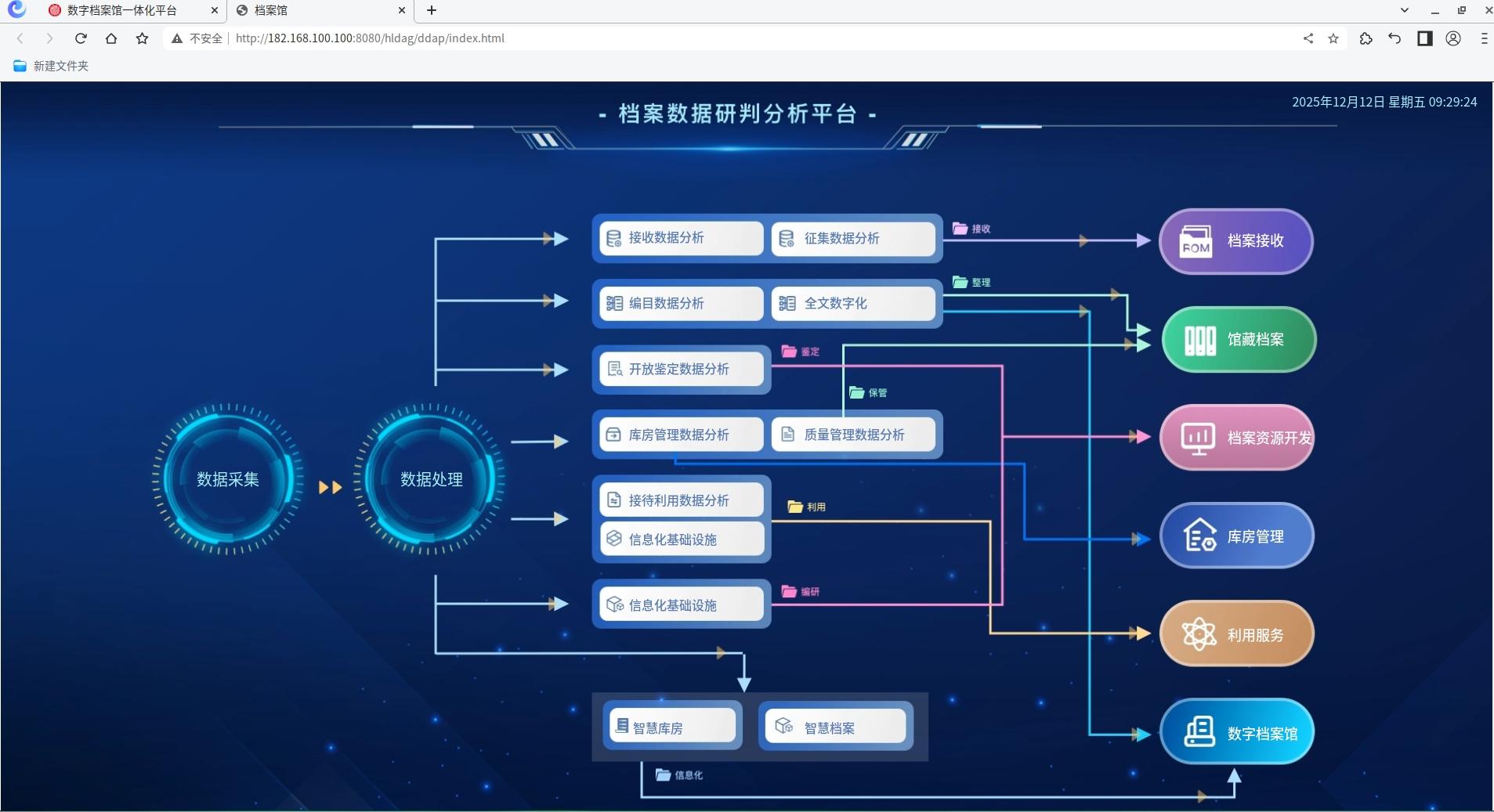 运用大数据、人工智能技术,对贺兰县数字档案各类业务数据、档案管理流程数据、档案馆运行监管等数据进行监管统计分析,如数字档案一体化平台各子系统业务、馆藏档案统计数据、档案数字化率、数字库房、每年接收进馆档案数量、档案利用情况、接待大厅接待利用情况、档案出入库情况、各类设备监测、登记情况等运用各类图、表、线、数字、动、静态动画等形式可视化监管展示数字档案馆整体使用、管理等情况。智能化研判、监管、预警、决策、指挥档案馆日常运和维护工作。