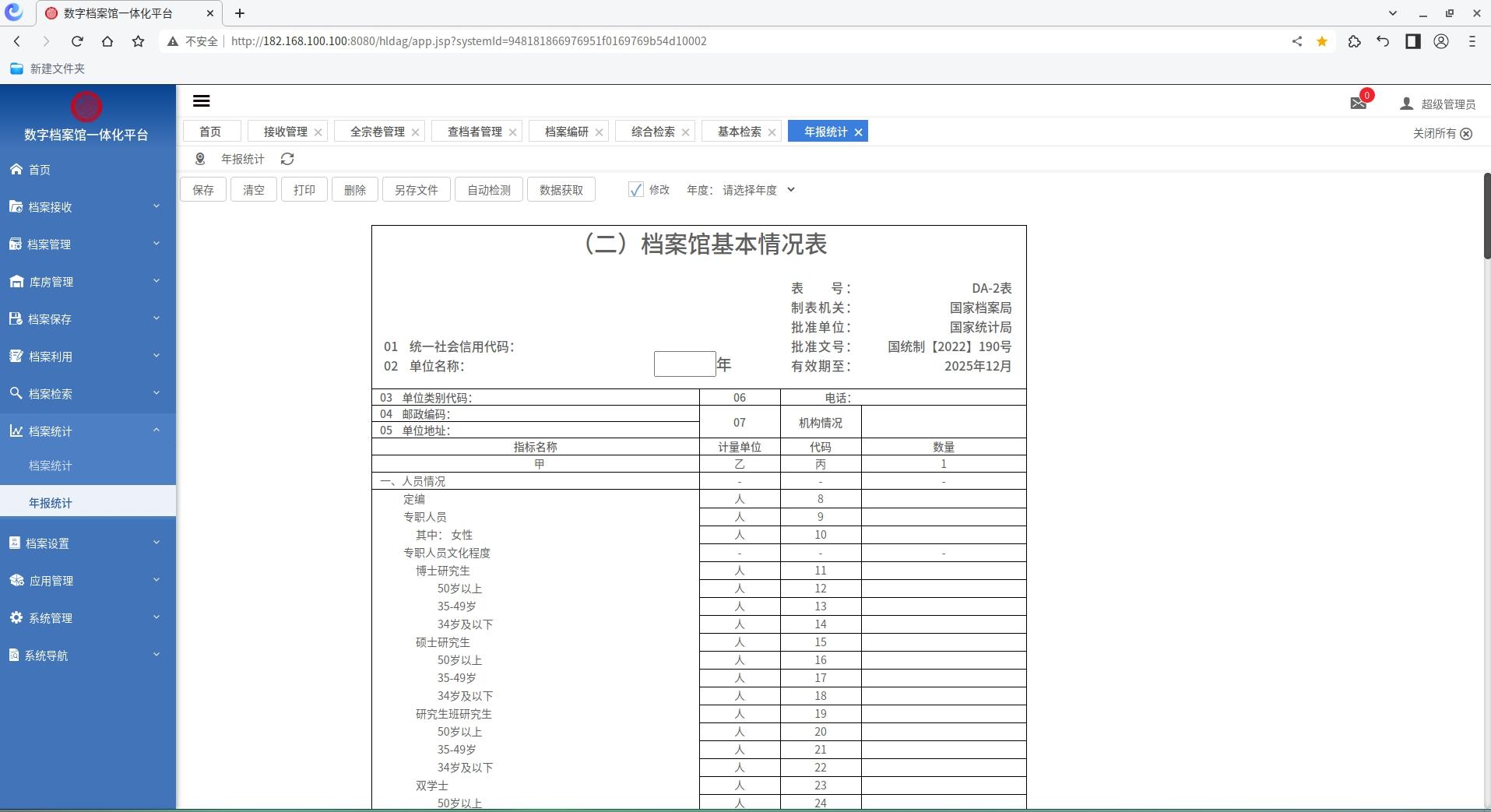 对馆藏档案数据进行多维度统计,系统提供自定义统计平台,实现档案收集、管理、保存、利用等维度的统计,并展示对应的统计表或统计图,支持标准格式的年报填写和数据自动获取功能。