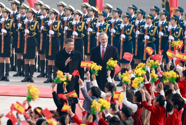 习近平欢迎费利佩六世国王访华,指出中国和西班牙都有深厚的历史文化底蕴。建交50多年来,两国坚持从战略高度和长远角度看待和发展双边关系,相互尊重、相互支持、相互成就,树立了不同历史文化、不同社会制度国家友好相处、共谋发展的典范,也为推动全球开放合作、维护国际公平正义发挥了重要作用。西班牙王室为中西关系发展作出了突出贡献。在两国迎来建立全面战略伙伴关系20周年之际,费利佩六世国王对中国进行国事访问,对推动两国友好合作不断向前发展具有重要意义。